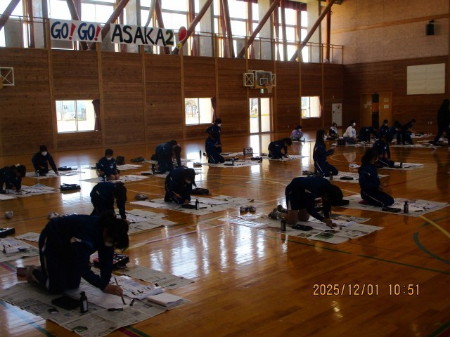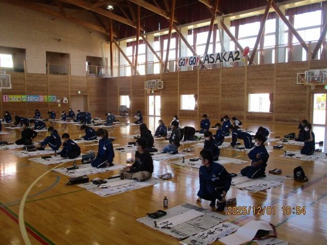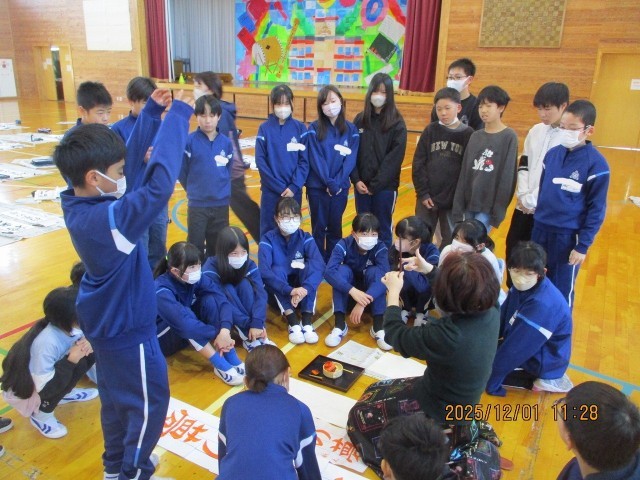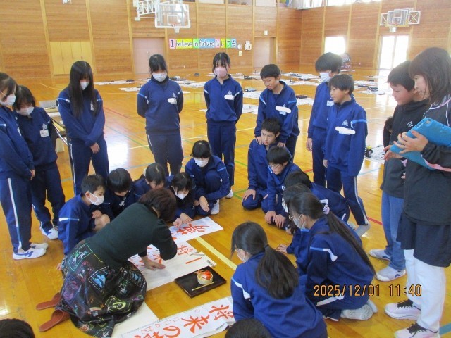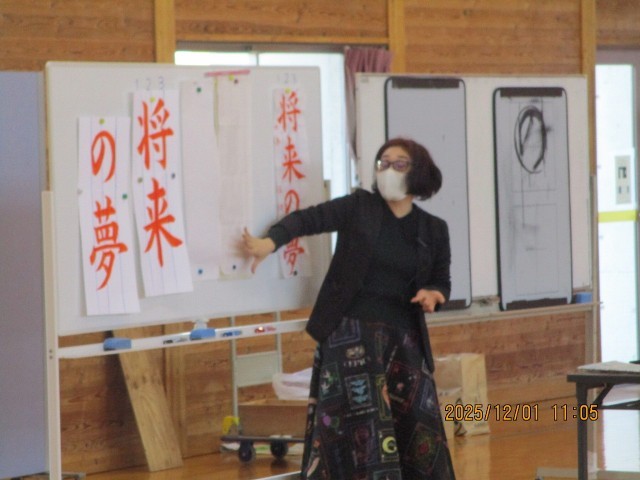 書道家の渡邉陽華先生をお招きして,6年生の書きぞめ指導を行いました。「将来の夢」~一文字一文字の丁寧なご指導に,6年生も..よい作品を仕上げたい思いと意欲を高めながら,3.4校時を集中して取り組みました。