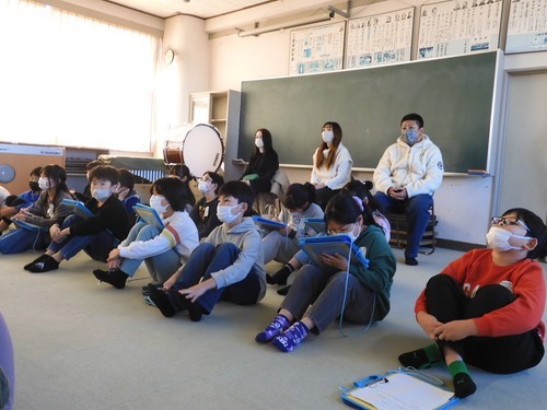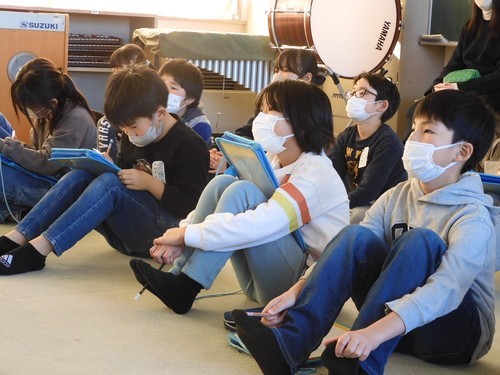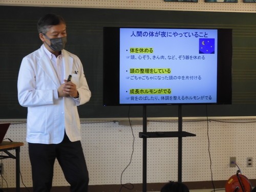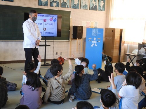 11月28日(金)の3校時に市内菊池医院の医師・菊池信太郎先生、管理栄養士の髙橋千春先生、シンタローくん(pepper)を講師にお迎えして学習しました。はじめに髙橋先生から食べもののもつ3つの働き(赤、黄、緑)や、偏食やおやつ、お菓子の食べ過ぎによる体への悪影響など、健康な体をつくるための食事について教えていただきました。後半は、3年生への事前アンケートをもとに、菊池先生からスマホやタブレット、ゲーム機の長時間使用への注意がありました。これらは子どもに一番大切な規則正しい生活リズムをこわす危険性があること、特に「すいみん」の役割とその大切さを教えていただきました。人間は眠っている時間に「昼間に学習したこと、考えたことでごちゃごちゃになっている頭の中を片付ける(記憶や考えたことを整理する)」そうです。睡眠時間が不足したままでは学習効果や行動によくない影響がでることは、実体験としても納得できますね。シンタローくん(pepper)が、途中で疲れて眠ってしまったのは昨日の睡眠不足のせいかも?しれませんね。(3名の保護者の方々が授業参観においでくださいました。ありがとうございました。)