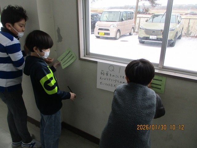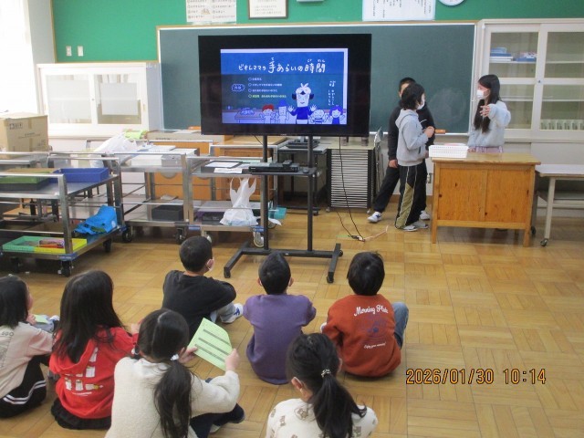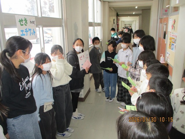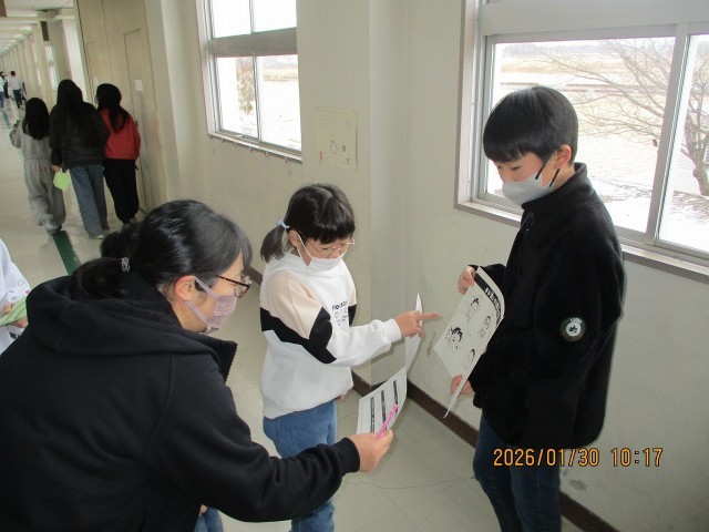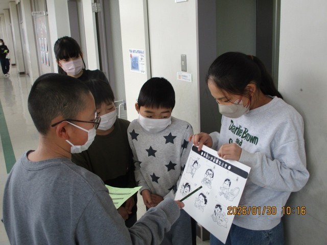 今日の業間も児童会:保健委員会の皆さんは大忙しでした!健康クイズウォークラリー2日目の今日は,2.4.5年生の番です。「上手な手洗いを覚えようコーナー」では,モニターで手洗い動画を紹介して..。校内の各所で繰り広げられる..ためになる健康クイズに,楽しみながらチャレンジしていました。