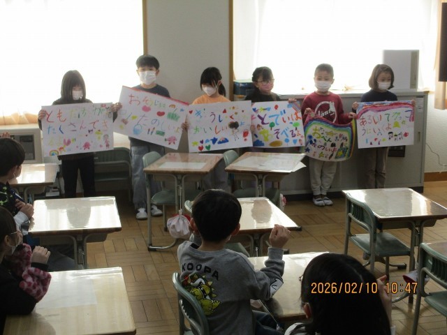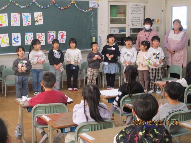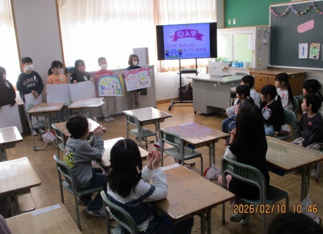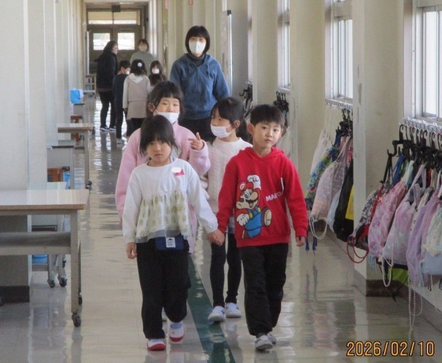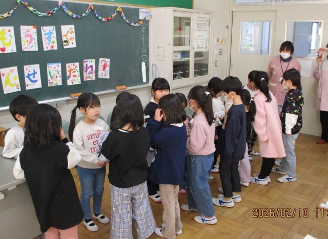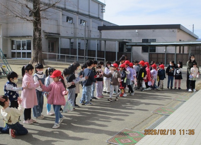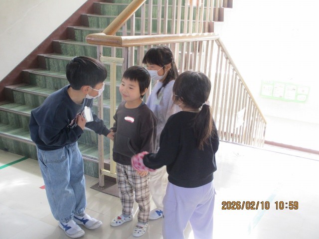 幼保小連携のひとつとして,今年度はの保育所と1年生の交流活動は,今日で3回目です。今日は,来年1年生になる9名の皆さんが、小学校に来て,「小学校って,こんなに楽しいところですよ」と1年生が教えてくれました。教室で出会いのあいさつ。保育所の皆さんとグループになって,1年生が学校を案内しました。やさしく手をつないで..階段をゆっくり上り下りしてくれる1年生!(さすが安積二小の1年生)生活科で作った,手作りの松ぼっくりけん玉をプレゼントして..,終わりのあいさつの時間になると,1年生から..「えぇ~ もっと一緒にいたいのに..」の声が。「まってるよ~」「また来てね~」昇降口でいつまでもいつまでも名残おしい見送りを交わす..1年生と保育所の皆さんでした。