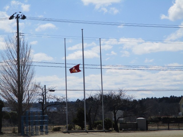 今日3月11日..子ども達は,いつもと同じように集団登校で学校に。。 でも,今朝の校旗掲揚塔の校旗は,半分まで(半旗)となっています。