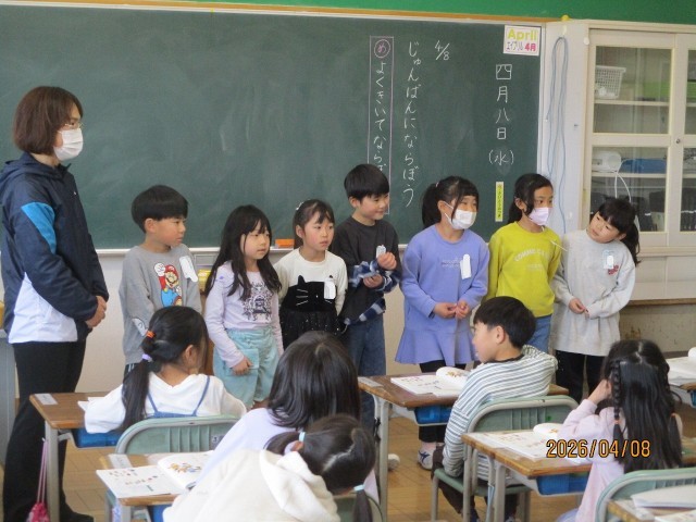 2校時目の下学年(1~3年生)教室の風景です。3年生は,1学期のめあてや自己紹介カードを楽しみながら仕上げていました。2年生は,国語科:ならぶ順番を班で話し合って..紹介。1年生は,隣の多目的室に移動して,様々な場面での「あいさつ」をチームになって確かめていました。