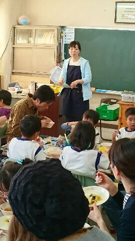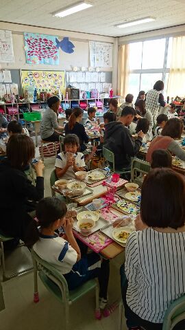 献立の揚げパンは、保護者のリクエストでした。親子で給食を楽しんでいました。