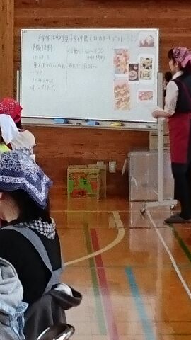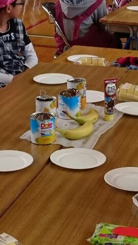 5年学年活動が体育館で行われています。5年生は「親子で仲良くロールケーキデコレーション」です。