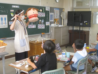 9月12日2・3時間目に歯科衛生士さんにおいでいただき、歯科教室を行いました。むし歯になりやすいおやつとなりにくいおやつがあることをに驚いていました。おやつは組み合わせを考えて食べること、歯ブラシのいろいろなところを使ってみがくことなどを学びました。実際に、カラーテスターを使って歯を染め、汚れを落としながら歯のみがき方を練習しました。汚れが落ちると、歯がつるつるすることを実感していました。