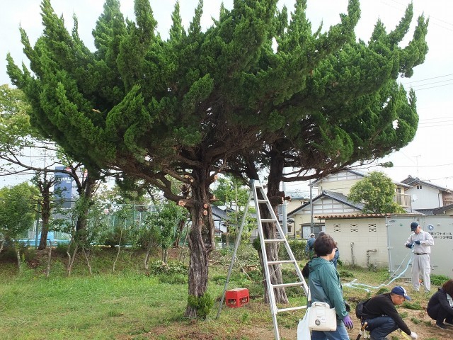プール周辺の樹木伐採は今年2回目となりました。前回の作業では、ハチの巣をたくさん見つけることができました。今回の作業により、プールの見通しもよくなり防犯上の視点からも安心して水泳学習を進めることができるようになりました。