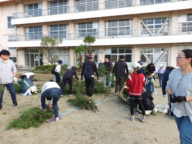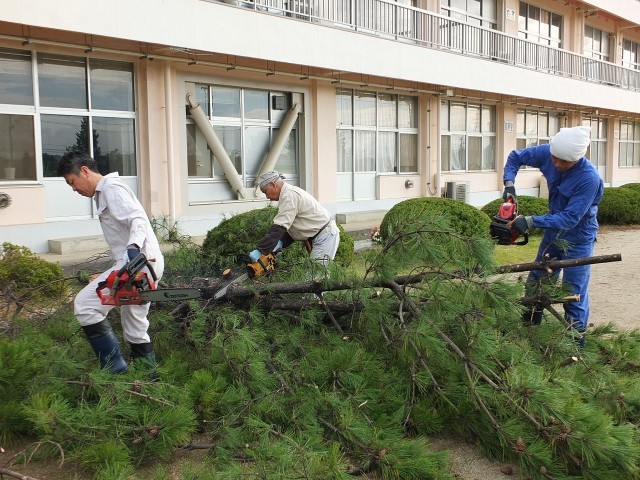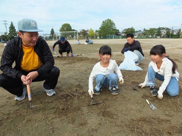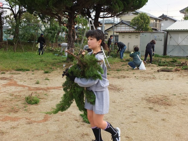 10月18日(土)の朝7時から8時30分、ボランティアをお申し出くださった方のお力をお借りして、プール周辺の樹木伐採・6年1組の窓に掛かる樹木の伐採、校庭トラック周辺の除草作業を行いました。