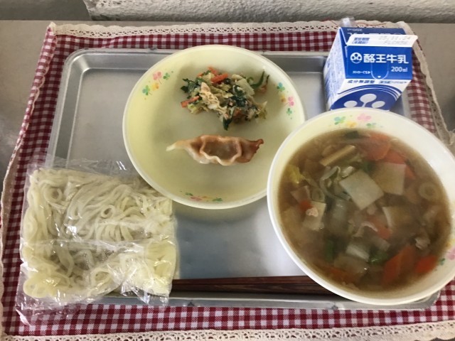 13日は「福島県産米粉ワンタンラーメン・牛乳・餃子・ナムル」ワンタンが、福島県産米粉でできたもの、白菜、小松菜、ほうれん草、ねぎ、もやしなど福島県内の野菜を使った料理です。