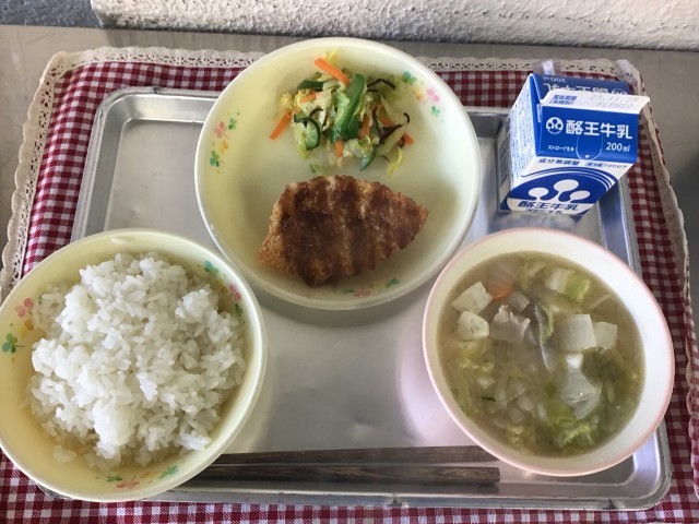 14日は「あさか舞ごはん・牛乳・かじきカツ・野菜の昆布あえ・豚汁」です。カジキはいわきの高校生が海洋実習で捕ってきたもので、いわき産です。豚肉、キャベツ、豚肉、ねぎ、きゅうりなどが福島県内のもので給食を作ることができました。