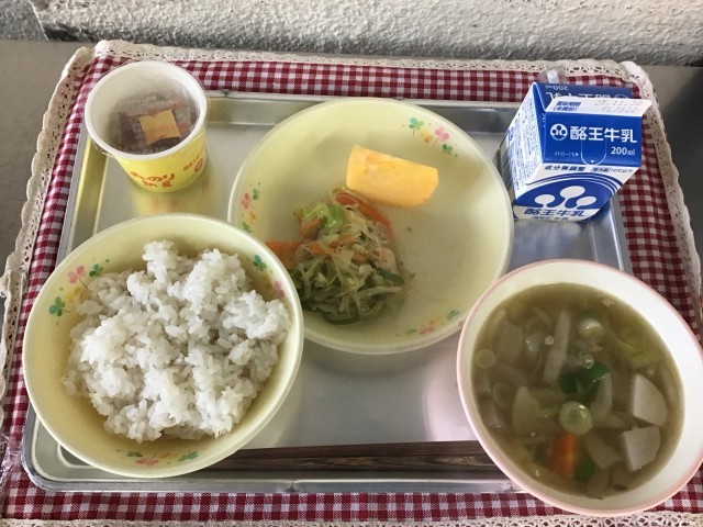 今日の給食は「麦ごはん・牛乳・納豆・春雨サラダ・いもこん鍋・身しらず柿」です。