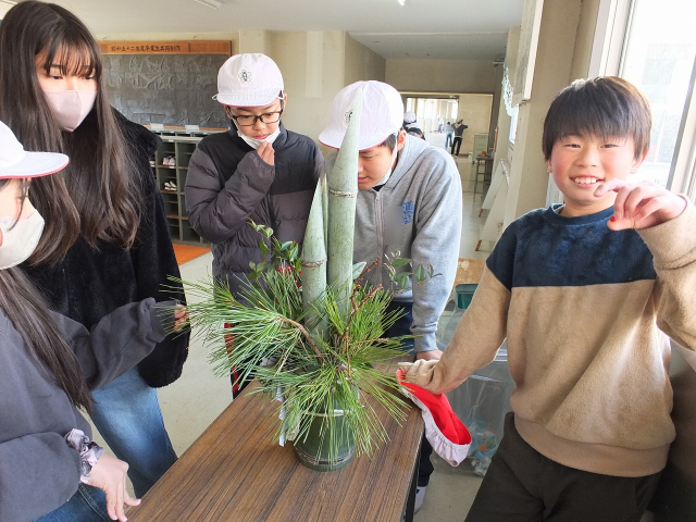 本日、青少協の方が、見本となる門松を届けてくださいました。本物を使って作られた門松は、目を惹きます。高学年の子どもたちは、すぐに近寄ってきて、その質感を確かめていました。自分で作る門松。こんな貴重な体験をぜひ!
