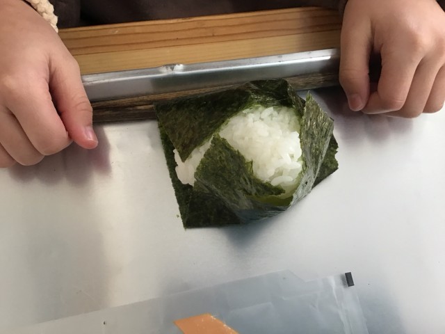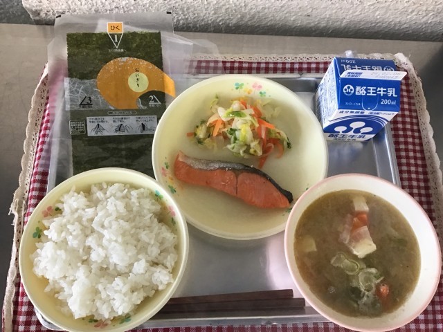 今日の給食は「塩ごはん・おにきりのり・牛乳・鮭塩焼き・たくあん入りつけもの・豚汁」です。1月24日が「給食記念日」です。初めて出された給食は「おにぎり、鮭、たくあん」だったことから、自分でおにぎりをつくる献立にしました。自分で作ったおにぎりは、特別においしいです。おいしい鮭を中にいれて鮭おにぎりにしても、鮭だけそのまま食べても食べ方は自由、自分で工夫して食べていました。考えて食べることも食教育の1つ。これからおにぎり作りに興味をもって、「おにぎりが作ることができる児童」が増えるとよいと思います。