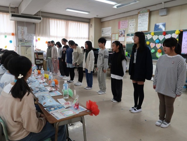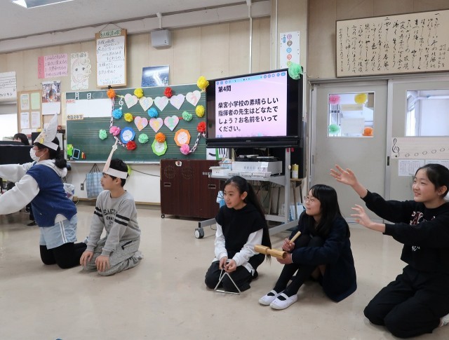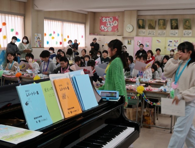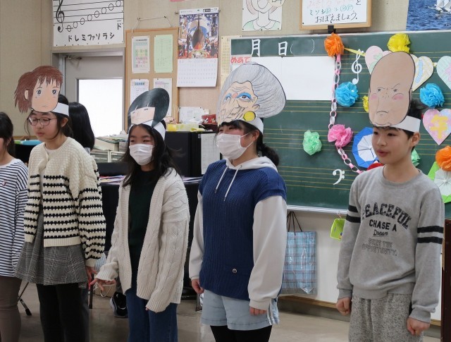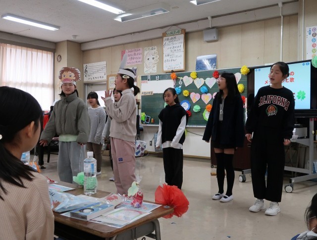 5年生は、ミュージカル仕立て。大きなお面を頭に付け、台詞と歌で盛り上げます。異空間に迷い込んでしまった6年生が元の世界に戻るにはクイズに正解することが必要です。静岡県で行われた全国大会に関する問題が出題されましたが、6年生は全問正解。そのプレゼントが5年生から渡された後に、5年生の歌声が響きました。次年度の合唱部を引っ張っていく5年生の歌声は力強いものでした。