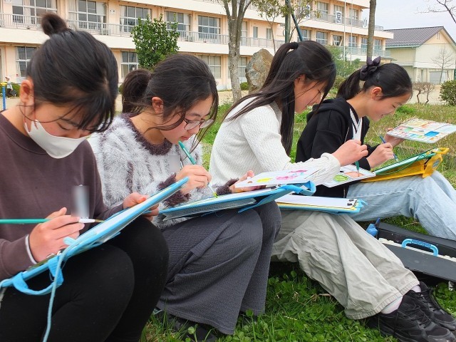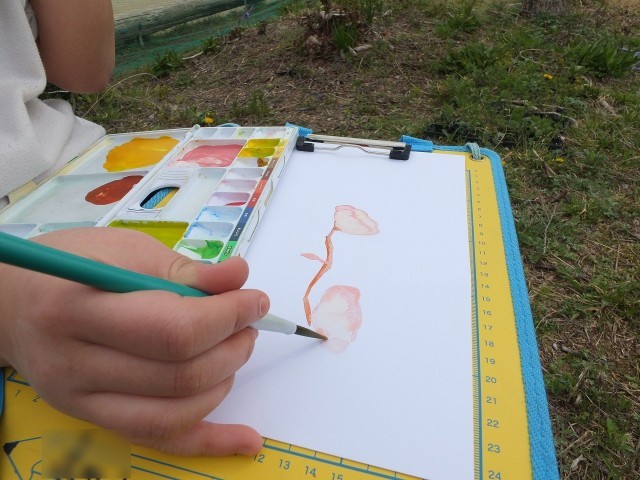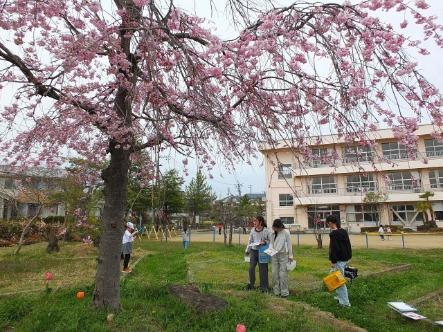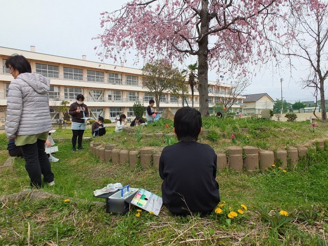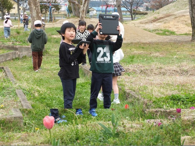 校庭には桜、チューリップや野原の草花が咲き乱れ、百花繚乱の様相を呈しています。また、子どもたちも花の美しさに魅入られ、写真を撮ったり絵を描いたりしながら、思い思いに自分の表現を楽しむ姿が見られました。