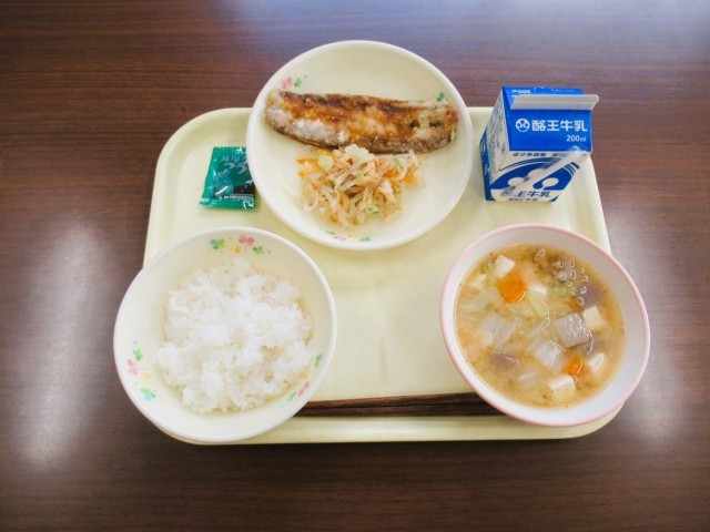 今日の給食のメニューは、ご飯、牛乳、ノリの佃煮、サンマのかば焼き、千草和え、けんちん汁です。
