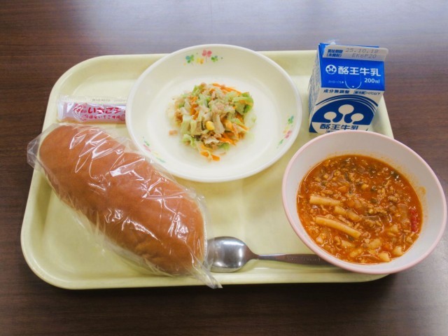 今日の給食のメニューは、コッペパン、牛乳、イチゴジャム、マカロニのミートソース煮、野菜とツナの和え物です。