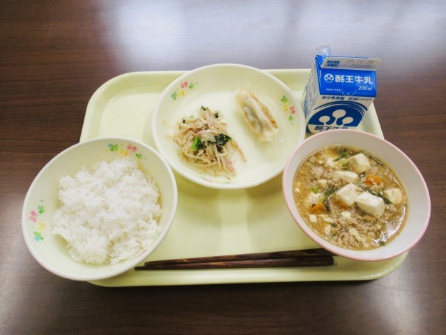 今日の給食のメニューは、麦ごはん、牛乳、麻婆豆腐、蒸し餃子、もやしのナムルです。