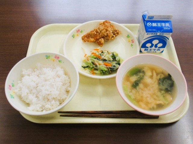 今日の給食のメニューは、麦ごはん、牛乳、鶏肉の竜田揚げ、和風サラダ、油揚げと小松菜の味噌汁です。