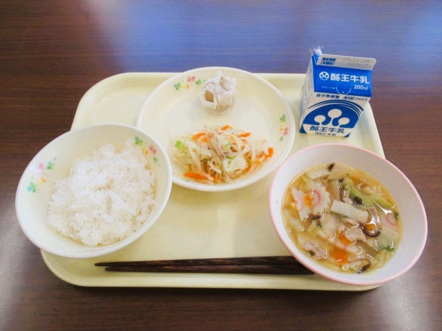 24日(金)の給食のメニューは、ご飯、牛乳、豚肉と野菜の中華風煮、肉シューマイ、豚肉と春雨の和え物です。