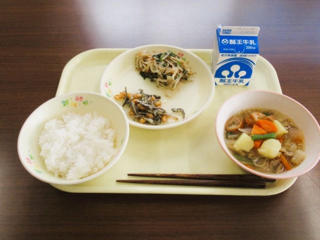 今日の給食のメニューは、ご飯、牛乳、肉じゃが、大豆と小魚の佃煮、ごま和えです。