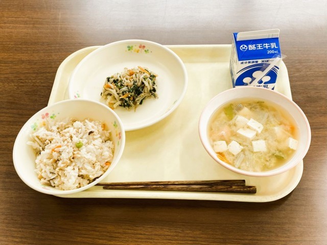 さて、今日の給食のメニューは、鶏ごぼうごはん、牛乳、石狩汁、ほうれん草のごま和えです。
