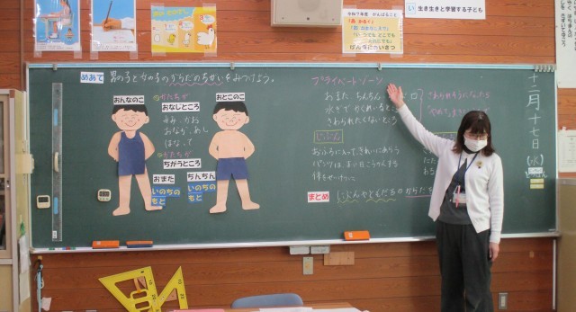 17日(水)学級活動で「おとこのこ おんなのこ たいせつなからだ」の学習をしました。養護教諭の白岩先生に男女の体の違いなどについて教えてもらいました。学習の終わりに、子どもたちは「自分や友達の体を大切にする。」「友達にやさしくする。」「プライベートゾーンを大切にする。」などこれから気を付けていきたいことを発表していました。