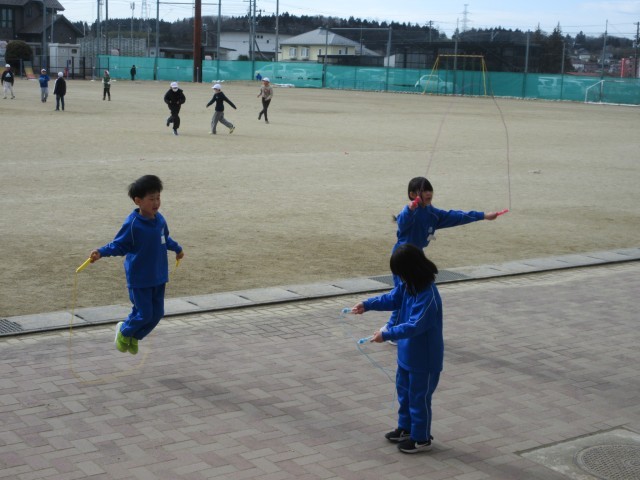 寒い中でもなわとび練習をする1年生たち。記録会に向けてがんばっています。