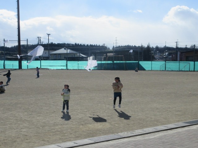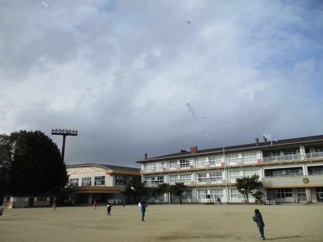 生活科の「ふゆとなかよし」の学習でたこあげをしました。風に乗ってぐんぐんあがるたこ。子どもたちは寒さに負けず、たこあげ遊びを楽しんでいました。