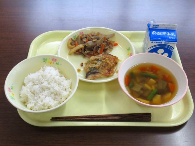 今日の給食のメニューは、ごはん、牛乳、さばの三味焼き、五目きんぴら、のっぺい汁です。