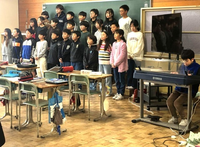 階段を上がっていくと、CDに合わせて練習しているのかな、と思うくらい、素晴らしい歌声が聞こえてきました。すると、なんと、自分たちだけで歌っているではありませんか!伴奏も卒業式当日さながらの演奏です。もう、感動のあまり、拍手をしてしまいました。