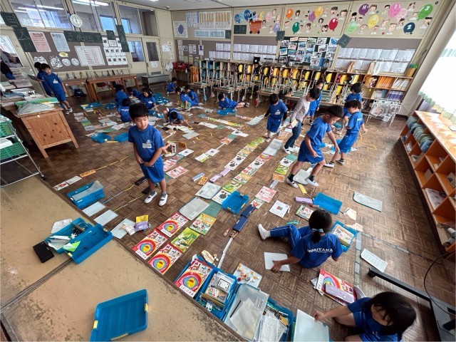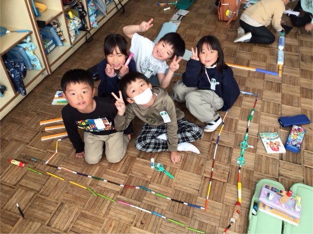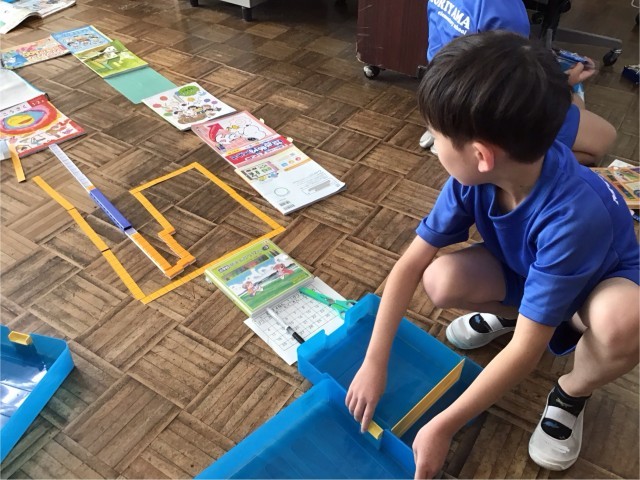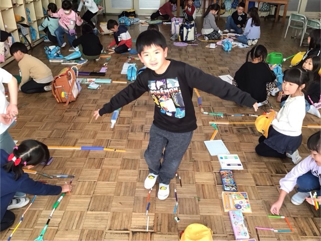 今日は図工の学習で、造形遊びを行いました。身の回りにある物を友達と関わり合いながら並べ、どんどん変化していく形の面白さを楽しむ内容です。普段は学習で使用している道具も、図工の材料に変身するといつもと違った姿に見えてきます。形や色に着目し、友達と仲良く相談しながら楽しむことができました。