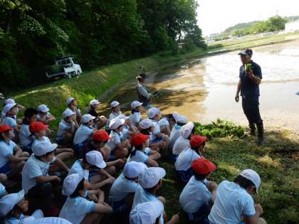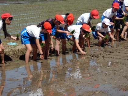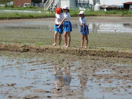 急に夏らしい天気が続きましたね。今日も日差しがジリジリとしていました。5年生は、田植えの体験学習をしてきました。実際に田んぼに素足で入り、自分の手で一株ずつ植えていきました。初体験の子がほとんどです。一つ動くたびに歓声が上がりました。地域の方のご協力、ご指導のもと、とても貴重な体験ができました。秋の稲刈り・収穫に向けてみんなで育てていきたいと思います。
