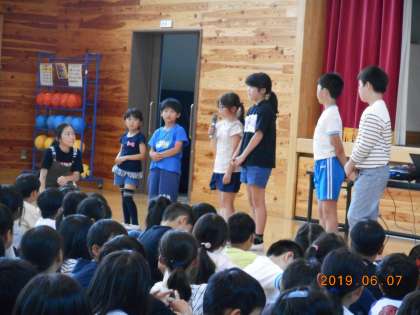 6月7日(金)全校集会が行われました。まず初めに、体育委員会の進行で「プール開き」が行われ、校長先生のお話、1年生から6年生までの代表児童の今年のプール学習のめあてやがんばりたいことの発表がありました。そのあと、体育主任から、プールでの学習でがんばってほしいことのお話がありました。