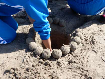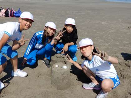 午後の活動は四倉海水浴場へ移動しての「砂の芸術」。