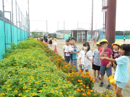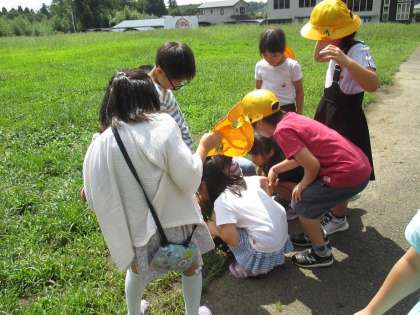 まずは、校庭の南側の花壇やヘチマ棚の辺りから、虫を探しました。