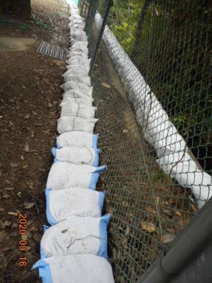 校庭西側には、土のうを積んでいましたが、再度、用務員さんや校長先生が、新しい土のうを追加して配置しています。