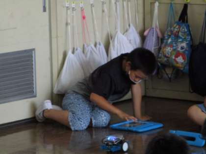 前回までの学習で学んだことを生かして、mBotを動かすという活動です。子どもたちは自分で走らせたいコースや動きをイメージしながら、楽しそうに取り組みました。