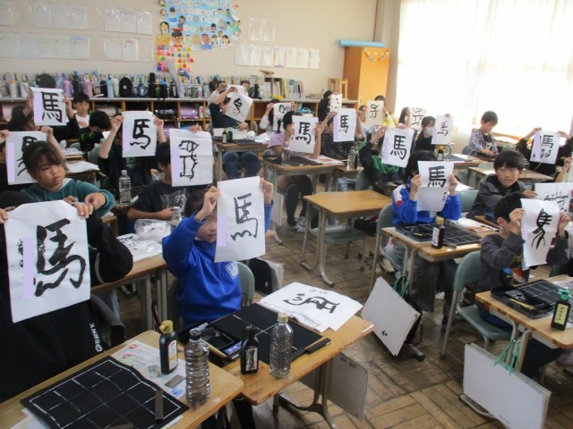 来年の干支「馬」の漢字の成り立ちから変遷についてお話をいただき、自分の書きたい「馬」を書きました。