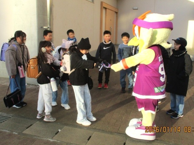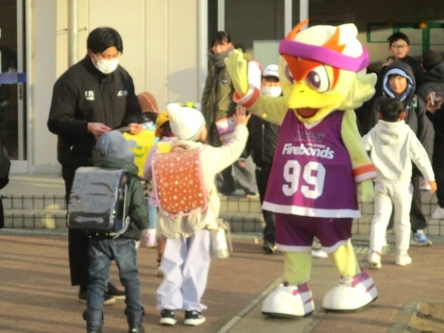 福島ファイヤーボンズのマスコット「ボンズくん」が朝のあいさつ運動を行いました。