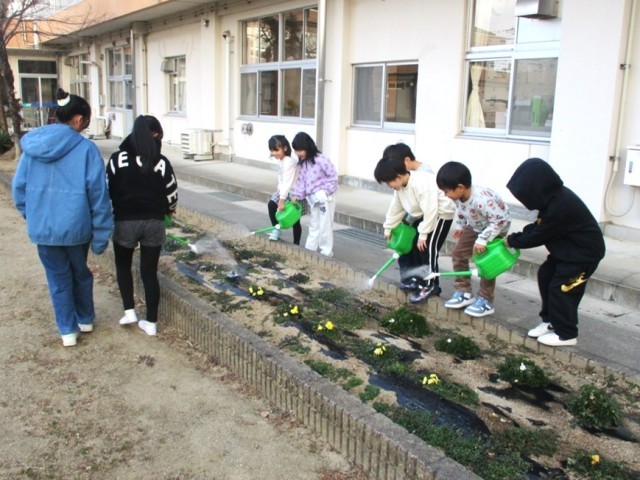 6年生が、1年生に花壇の水やりを教えてくれました。