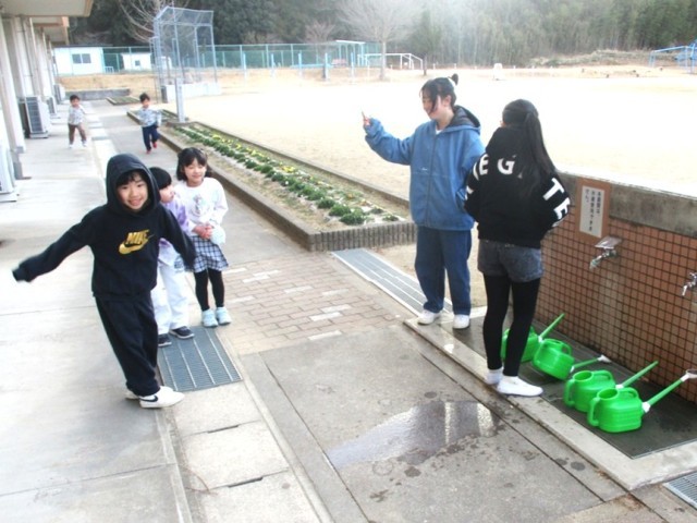 上手に水やりができた1年生は、とても嬉しそうでした。やさしい6年生です。