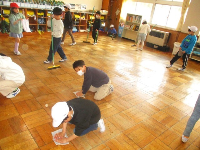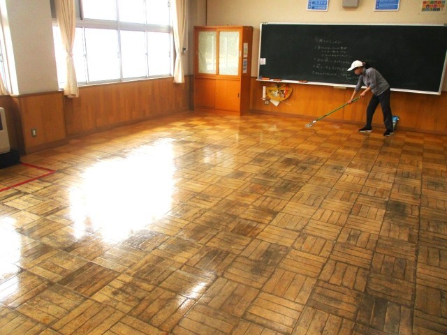 児童下校後、教職員でワックスがけをしました。