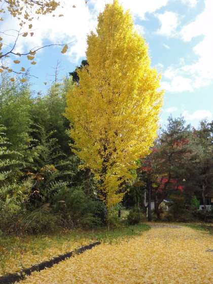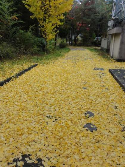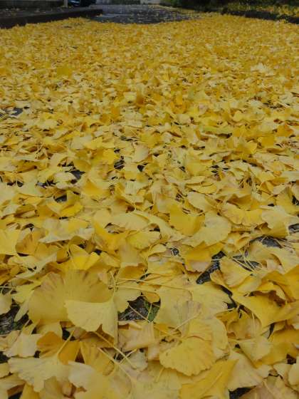 イチョウの葉が落ちて、黄金色のジュータンができました。