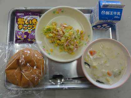 今日の献立は、米粉パン、白菜のクリーム煮、コーンサラダ(フレンチ味)、紫いもチップス、牛乳でした。