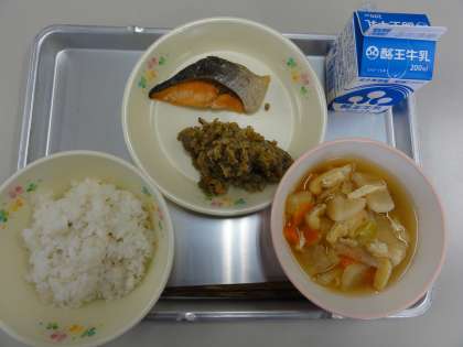 今日の献立は、麦ごはん、鮭の塩焼き、うの花いり、大根と油あげのみそ汁、牛乳でした。