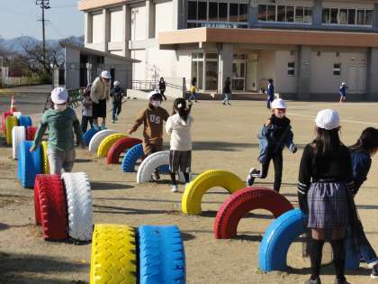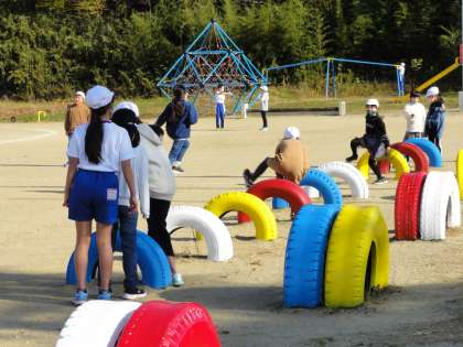 タイヤを跳び越えて、出会ったらじゃんけん。負けた方が戻ります。