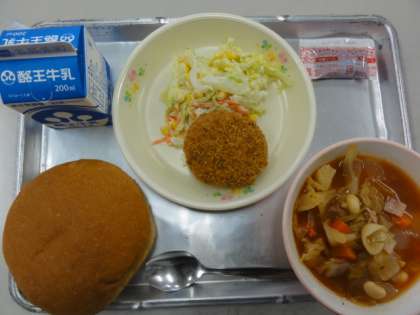 今日の献立は、バンズパン、メンチカツ、パックソース、コールスロー、ミネストローネ、牛乳でした。
