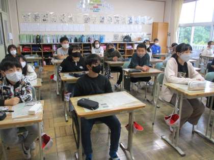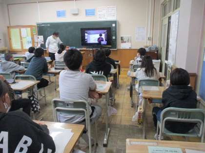 本日、5、6年生は、8日(水)に実施する小中連携地域ボランティアについて、高瀬中学校の生徒とZoomで会議(何をするかの説明を聞くこと)を行いました。各教室のテレビ画面に高瀬中学校の生徒や先生が映し出され、各方部ごとに行う活動について、説明してくれました。