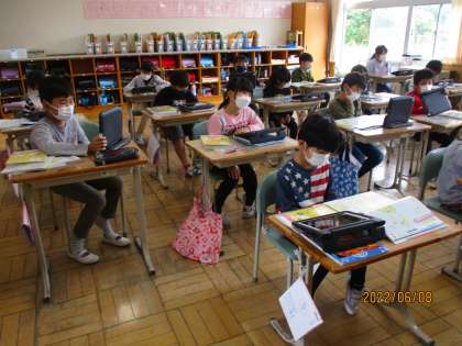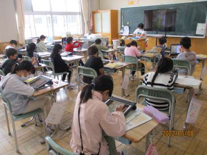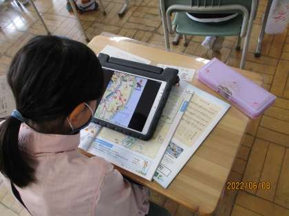 3年1組では、社会の時間に国道4号線や国道49号線の起点と終点について、タブレット端末で地図を呼び出し確認しました。子どもたちは、先生から悦明を受けて、理解していました。