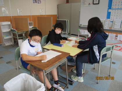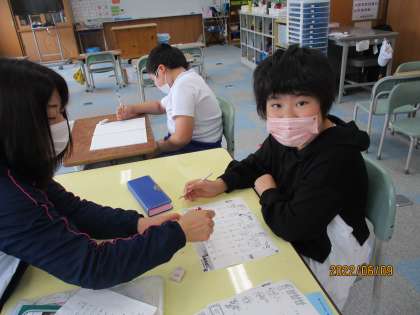 あおぞら学級では、4年生と5年生がそれぞれ自分の課題に取り組んでいました。5年生の児童は、先生と一緒になって、ことばの勉強を一生懸命行っていました。